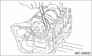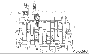 4. Use a thickness gauge to measure the thrust clearance of crankshaft at center bearing. If clearance exceeds the standard, replace the bearing. Crankshaft thrust clearance: Standard 0.040 — 0.212 mm (0.0016 — 0.0083 in)