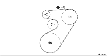 CAUTION: Check and adjust the V-belt tension so that it is within the specified range. Using the belt with a tension out of the specified range may result in a fault such as the following: • If the V-belt tension is higher, unexpected force is generated at the power steering oil pump, generator and crankshaft bearing, causing abnormal noise due to abnormal wear of the bearing. • If tension of the V-belt is too low, slipping of the V-belt and crank pulley occurs and crank pulley becomes abnormally hot by friction heat. If this condition repeatedly occurs, the V-belt may abnormally wear, causing abnormal noise, V-belt damage or crank pulley damage. 1. Replace the V-belt, if cracks, fraying or wear is found. 2. Inspect the V-belt tension, and adjust if necessary. V-belt tension (with sonic belt tension gauge): When installing new parts 1080 — 1230 N (110 — 125 kgf, 243 — 277 lbf) At inspection 570 — 720 N (58 — 73 kgf, 128 — 162 lbf) NOTE: For inspection using sonic belt tension gauge, input of setting value may be needed. • Belt distance (SPAN) between measuring point to pulley: 163 mm (6.42 in) • V-belt weight (WEIGHT): 14.9 g (0.033 lb)/m • V-belt width (WIDTH): 6 mm (0.24 in)/#R