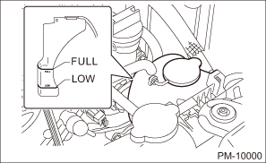 CAUTION: • Do not use water instead of coolant. • Refer to “RM” section for the recommended engine coolant. 1. Park the vehicle on a level surface. 2. Make sure the engine coolant level in the reservoir tank is between “FULL” and “LOW” when the engine is cold. NOTE: If the engine coolant level drops, make sure that there are no engine coolant leakage, and add engine coolant to the “FULL” line.