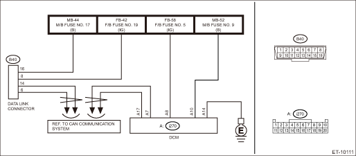 1. COMMUNICATION FOR INITIALIZING IMPOSSIBLE When communication with DCM is impossible DETECTING CONDITION: • Defective harness connector • Power supply circuit malfunction • Defective DCM • Defective CAN communication circuit • Defective Subaru Select Monitor TROUBLE SYMPTOM: Communication is impossible between DCM and Subaru Select Monitor. CAUTION: CommCheck is required after replacing the DCM. Telematics System > OPERATION WIRING DIAGRAM: NOTE: For the coupling connector, refer to “WIRING SYSTEM”. Telematics Telematics System > WIRING DIAGRAM
