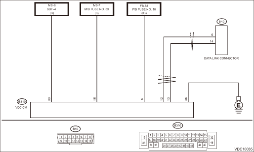 7.CHECK POWER SUPPLY CIRCUIT. 1) Turn the ignition switch to ON. (Engine OFF) 2) Measure the ignition power supply voltage between VDCCM&H/U connector and chassis ground. Connector & terminal (B310) No. 5 (+) — Chassis ground (−): (B310) No. 16 (+) — Chassis ground (−): (B310) No. 33 (+) — Chassis ground (−): | Is the voltage 10 — 15 V- | Subaru Select Monitor > INSPECTION | Repair open circuit in harness between VDCCM&H/U and battery. |