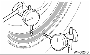 1. TIRE CAUTION: When replacing a tire, make sure to use tires of the same size, construction and load range as originally installed. 1. Tire size and tire inflation pressure check General Description > SPECIFICATION 2. Cracks, damage and wear check 3. Tire runout check (1) Lift up the vehicle. (2) Slowly rotate the wheel to check rim “runout” using a dial gauge.