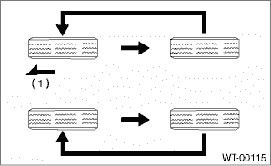 • Aluminum wheel Service limit: Axial and longitudinal runout: 1.0 mm (0.039 in) • Steel wheel Service limit: Axial and longitudinal runout: 1.5 mm (0.059 in) (3) If the rim runout exceeds service limit, replace the wheel. 2. TIRE ROTATION NOTE: Rotate tires periodically (9,600 km/6,000 miles) in order to prolong life and to prevent uneven wear. Rotate tires as shown in the figure depending on whether or not the direction of the tire rotation is specified. • When the direction of tire rotation is not specified