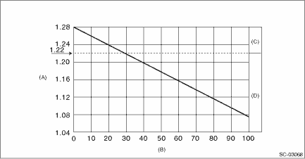 WARNING: • As batteries produce flammable gases, be careful not to bring an open flame close to the batteries. • Ventilate sufficiently when using or charging battery in enclosed space. • Electrolyte is corrosive acid, and has toxicity; be careful of handling the fluid. • For safety, in case an explosion does occur, wear eye protection or shield your eyes when working near any battery. In addition, never lean over the battery. • Be careful that the electrode does not come into contact with skin, eyes or clothing. Especially at contact with eyes, flush with water for 15 minutes and get prompt medical attention. • Be careful not to let the electrode contact with the coated parts. • Before starting work, remove rings, metal watch-bands, and other metal jewelry. • Be careful not to let the metal tools contact the positive battery terminal and anything connected to it. When the operation using a metal tool to the positive terminal or anything connected to it is required, disconnect the battery ground terminal before starting the operation. 1. APPEARANCE Check the battery case, top cover and terminal posts for dirt or cracks, and perform the following work as necessary. • Clean the battery with water and wipe with a dry cloth. • Apply a thin coat of grease on the terminal posts to prevent corrosion. Check • Normal > Go to the check item 2. • Abnormal > Replace the battery. 2. ELECTROLYTE LEVEL Check the electrolyte level in each cell. CAUTION: Do not fill beyond MAX level. NOTE: If the level is below the middle point between MIN level and MAX level, pour distilled water into the battery cell to bring the level to MAX. Check • MAX level > Go to the check item 3. • Below the middle point between MIN level and MAX level > Fill > Go to the check item 3. 3. SPECIFIC GRAVITY OF ELECTROLYTE Check the specific gravity of the electrolyte using a hydrometer and a thermometer. NOTE: • Specific gravity varies with temperature of electrolyte so that it must be corrected at 20°C (68°F) using the following calculation: S20 = St + 0.0007 - (t − 20) S20: Specific gravity corrected at electrolyte temperature of 20°C St: Measured specific gravity t: Measured temperature (°C) • When measuring in a simplified manner using the battery terminal voltage, calculate the specific gravity by the following formula. Specific gravity = [ 0.187 - battery terminal voltage (V) ] − 1.1 Perform the steps 1) and 2) before measuring the voltage in order to stabilize the voltage. 1) Turn the ignition switch to OFF and illuminate the headlight for 30 seconds. 2) After turning off the headlight, leave the vehicle for one minute. • Measuring the specific gravity of the electrolyte in the battery will disclose the state of charge of the battery. The relation between specific gravity and state of charge is as shown in the figure.