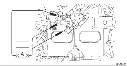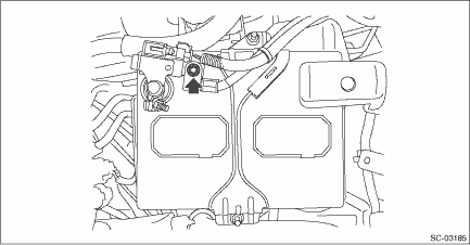 (6) Turn the ignition switch to OFF. (7) Operate the front hood lock release lever to unlock the front hood. (8) Close all the doors (including rear gate and trunk lid) and then lock the doors. (Security alarm is in set condition) NOTE: For model with keyless access function, take the access key 1.5 m or more away from the vehicle after the door lock. And do not put the access key close to the vehicle while measuring the standby current. (9) Wait for 5 minutes after door lock until the standby current stabilizes. (10) Loosen the nut which holds the ground terminal to the battery. NOTE: Do not remove the ground terminal.