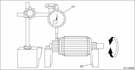 1. ARMATURE 1. Check the commutator for signs of seizure or stepped wear caused by roughness of the surface. If there is light wear, use sandpaper to repair. 2. Check for runout on the commutator. If excessive, replace the armature. Commutator runout: Standard 0.05 mm (0.0020 in) Limit 0.10 mm (0.0039 in)