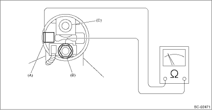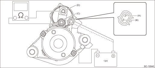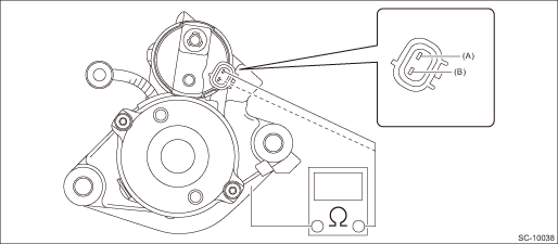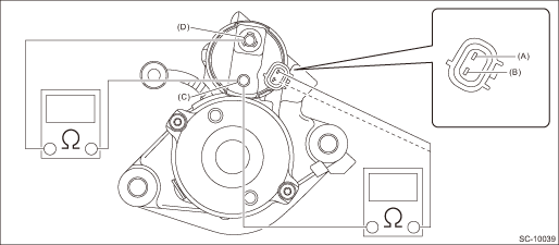 3. Using a circuit tester, check there is no continuity between SL1 (pinion terminal) and M terminal, between SL2 (contact terminal) and M terminal, and between M terminal and B terminal.