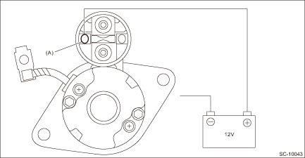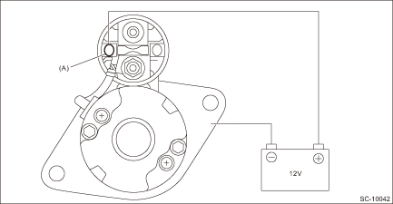 2. Connect the battery positive terminal to the switch assembly S terminal, and connect the battery negative terminal to the starter body. Then, if the pinion protrudes, it is normal. NOTE: The starter motor may rotate while the pinion protrudes. This occurs due to current that flows to the motor via pull-in coil. This is not a problem.
