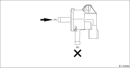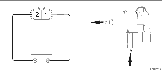 4. Connect the battery positive terminal to the terminal No. 1 and the battery negative terminal to the terminal No. 2. Check that air is discharged from (B), when supplying air to (A).