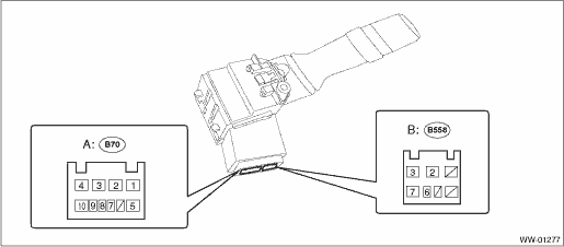 2. Replace the switch if the inspection result is not within the standard value. 3. Install the switch assembly - combination wiper select. Combination Switch (Wiper) > INSTALLATION 2. FRONT WIPER 1. Check with Subaru Select Monitor (1) Check the input signal when the switch assembly - combination wiper select is turned to LO or HI, using the current data display. (2) Does the input signal change corresponding to the switch operation- • Yes > Finish the diagnosis. • No > Check the harness. 2. Check the intermittent operation (inspection of the wiper switch alone)