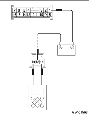 2. If the inspection result is not within the standard, replace the switch - power window main. 2. SUB-SWITCH Passenger’s seat (model with AUTO) CAUTION: Since the switch - power window main is controlled by CPU, do not check continuity for switch alone with the circuit tester. Performing continuity check with circuit tester can damage the switch - power window main circuit. Check output from the switch - power window sub to the passenger’s side motor using the oscilloscope function in the Subaru Select Monitor. 1. Remove the switch - power window sub. 2. Connect the battery and the Subaru Select Monitor to the switch - power window sub terminal. CAUTION: Never mix up the terminals when connecting the harness connector of the switch - power window sub and the battery. If the connection is wrong, the switch - power window sub may be damaged. NOTE: • When the battery is connected to the switch - power window sub terminal, the letters “AUTO” on the passenger’s side knob illuminates. • For detailed procedures, refer to “Subaru Select Monitor Operation Manual”.