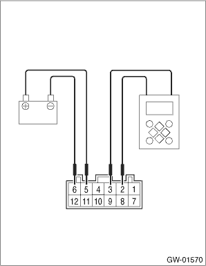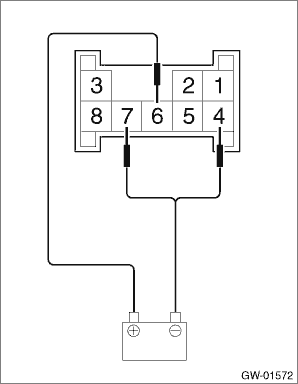 1. MAIN SWITCH • Driver’s seat (model with AUTO) CAUTION: • Since the switch - power window main is controlled by CPU, do not check continuity for switch alone with the circuit tester. Performing continuity check with circuit tester can damage the switch - power window main circuit. • Since the passenger’s seat switch cannot be checked by using the switch - power window main, use the switch - power window sub. Check output from the switch - power window main to the driver’s side motor using the oscilloscope function in the Subaru Select Monitor. 1. Remove the switch - power window main. 2. Connect the battery and the Subaru Select Monitor to the switch - power window main terminal. CAUTION: Never mix up the terminals when connecting the harness connector of the switch - power window main and the battery. If the connection is wrong, the switch - power window main may be damaged. NOTE: • When the battery is connected to the switch - power window main terminal, the letters “AUTO” on the driver’s side knob illuminates. • For detailed procedures, refer to “Subaru Select Monitor Operation Manual”.