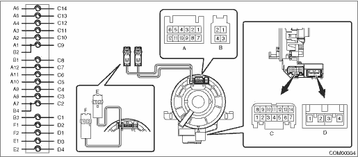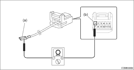 1. CHECK HORN SWITCH CAUTION: Refer to “CAUTION” of “General Description” before handling the airbag system components. General Description > CAUTION 1. Disconnect the ground terminal from the battery sensor, and wait for at least 60 seconds before starting work. NOTE 2. Remove the driver’s airbag module. Driver’s Airbag Module > REMOVAL 3. Check that the connection of the horn switch harness connector is correct. 4. Measure the resistance between connectors. Preparation tool: Circuit tester