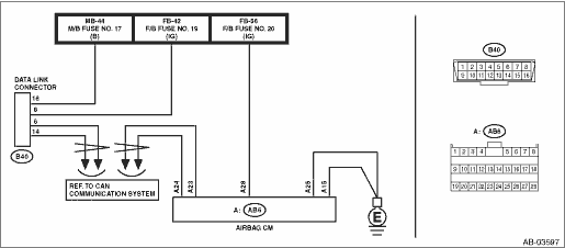 12.CHECK POWER SUPPLY CIRCUIT. 1) Disconnect the connectors (AB6, AB17, AB18) from airbag control module. 2) Connect the connector (1AD) in test harness AD AV to the connectors (AB6, AB17, AB18). 3) Connect the connector (2AD) in test harness AD AV and the connector (1AG) in test harness AG. 4) Turn the ignition switch to ON. 5) Measure the voltage between connector (2AG) in the test harness AG and chassis ground. Connector & terminal (2AG) No. 1 (+) — Chassis ground (−): | Is the voltage 10 V or more- | Subaru Select Monitor > INSPECTION | Repair the harness between the airbag control module and the battery. Or replace the airbag main harness along with the bulkhead harness. |