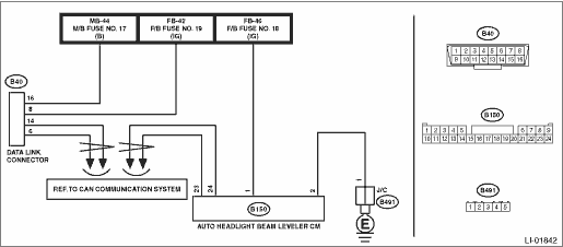 1. COMMUNICATION FOR INITIALIZING IMPOSSIBLE Communication error with auto headlight beam leveler CM DETECTING CONDITION: • Defective harness connector • Power supply circuit malfunction • Defective auto headlight beam leveler CM • Defective CAN communication circuit • Defective Subaru Select Monitor TROUBLE SYMPTOM: Communication is impossible between auto headlight beam leveler CM and Subaru Select Monitor. CAUTION: Initialization is required after replacing the auto headlight beam leveler CM. WIRING DIAGRAM: NOTE: For the coupling connector, refer to “WIRING SYSTEM”. Headlight beam leveler system Headlight Beam Leveler System > WIRING DIAGRAM