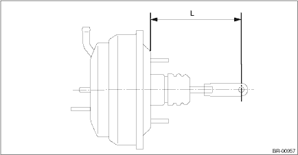1. Check and adjust the operating rod of the vacuum booster assembly. (1) Measure the length between the vacuum booster assembly mounting surface and clevis pin hole. (2) If it is not within the specification, loosen the lock nut, rotate the vacuum booster assembly operating rod to adjust the rod length. Specification L: 136.3 mm (5.37 in)