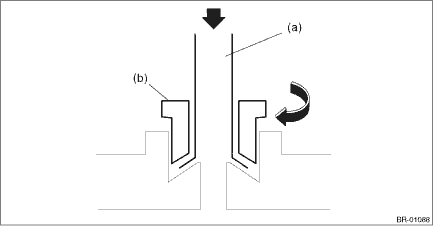 1. FRONT BRAKE HOSE 1. Secure the brake hose to the brake hose mount part of strut COMPL. Tightening torque: Brake hose: 33 N·m (3.4 kgf-m, 24.3 ft-lb) 2. Connect the brake hose to the caliper body assembly using a new gasket. Tightening torque: Union bolt: 26 N·m (2.7 kgf-m, 19.2 ft-lb) 3. Position the disc rotor in straight position and route the brake hose through the hole in the bracket on the wheel apron side. CAUTION: Do not twist the brake hose. 4. Connect the brake pipe and the hose, then temporarily tighten the flare nut. 5. Secure the brake hose to wheel apron bracket with clamp. 6. Turn and tighten the flare nut (b) by hand while pushing the brake pipe (a) away from yourself. CAUTION: Be careful not to make scratches or other damage to the inside surface of the brake pipe flare. Tightening torque: Brake pipe flare nut: 15 N·m (1.53 kgf-m, 11.1 ft-lb)
