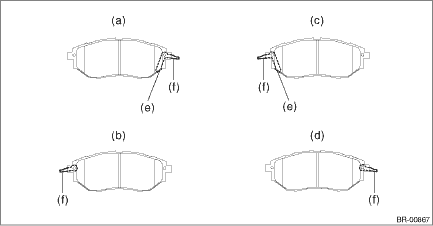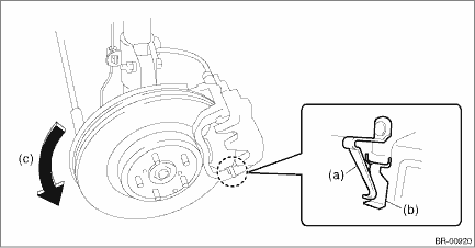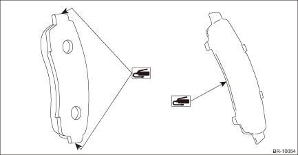 3. Install the pad - disc brake front. CAUTION: • Be sure to install so that the pad return spring faces the input side of the direction of disc rotor rotation, as shown in the figure. • Correctly install the pad return spring to the supporting surface of the pad clip as shown in the figure. • If the pad return spring is deformed or damaged, replace the pad - disc brake front with a new part.