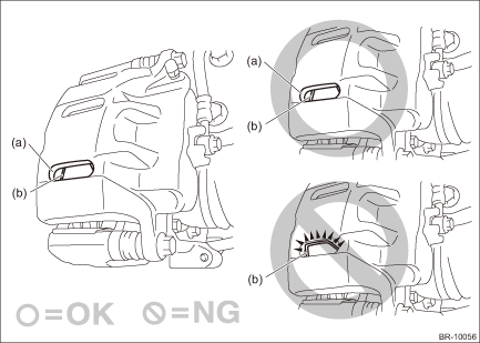 5. Install the caliper body assembly. Tightening torque: 50 N·m (5.1 kgf-m, 36.9 ft-lb) NOTE: Install so that the spring - brake pad (b) does not protrude out of the hole (a).