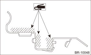 3. Apply a thin coat of grease to the shim - disc brake front and the pad - disc brake front. • Inner side: Apply a thin coat of grease to the both sides of shim - disc brake front inner and the pad - disc brake front. Grease: Shim and pad: Molykote M77 or equivalent