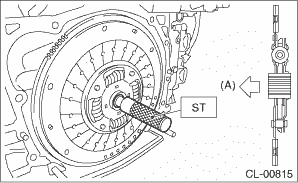 1. Insert the ST into the clutch disc and insert the ST end into the pilot bearing. NOTE: When installing the clutch disc, be careful to attach in the correct direction.