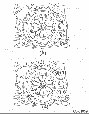 2. Install the clutch cover and tighten the bolts to specified torque. NOTE: • When installing a clutch cover, position the clutch cover so that the spacing between the unbalance marks (paint mark) on the flywheel and clutch cover is 120° or more apart. (The unbalance mark indicates the direction of residual unbalance.) • Temporarily tighten the bolts by hand. Each bolt should be tightened to the specified torque in a crisscross order. Tightening torque: 16 N·m (1.6 kgf-m, 11.8 ft-lb)