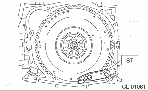 2. Temporarily tighten the crankshaft position sensor plate and flywheel. NOTE: Align the knock pin hole of the crankshaft position sensor plate to the knock pin of the crankshaft to secure the knock pin. 3. Attach the ST.