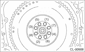 4. Tighten the flywheel mounting bolts in two stages. (1) Tighten the flywheel attachment bolts. Tightening torque: 30 N·m (3.1 kgf-m, 22.1 ft-lb)