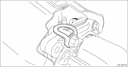 2. Replace the front differential side retainer oil seal. Differential Side Retainer Oil Seal > REPLACEMENT NOTE: • Be sure to replace the differential side retainer oil seal with a new part whenever the front drive shaft is removed from the transmission. • When a new differential side retainer oil seal has been installed, replacement is not required. 3. Install the cushion rubber on the transmission. Transmission Mounting System > INSTALLATION 4. Mount the transmission onto the transmission jack. 5. Strike and bend the transmission hanger of transmission rear with a soft rubber hammer etc. so that it gets in contact with the transmission case. CAUTION: Do not apply extra overload or impact to the transmission case.