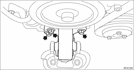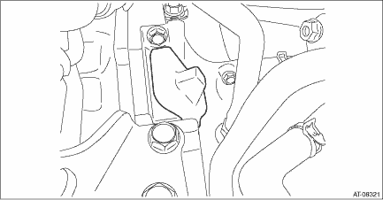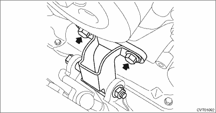 8. Install the transmission rear crossmember. Transmission Mounting System > INSTALLATION 9. Install the hanger bracket. Tightening torque: 23 N·m (2.3 kgf-m, 17.0 ft-lb) 10. Remove the transmission jack. 11. Lower the vehicle. 12. Remove the ST (ENGINE HANGER). 13. Install the three engine mounting bolts (upper side). Tightening torque: 50 N·m (5.1 kgf-m, 36.9 ft-lb)