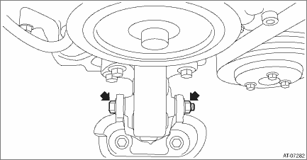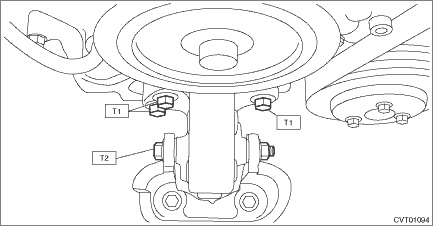 20. Tighten the bolts and nuts of front cushion rubber. NOTE: Always start tightening from the bolts on the engine side. Tightening torque: T1: 25 N·m (2.5 kgf-m, 18.4 ft-lb) T2: 45 N·m (4.6 kgf-m, 33.2 ft-lb)