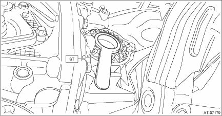 27. Remove the ST (STOPPER SET) from converter case. 28. Match the torque converter screw hole with drive plate hole to install the bolt. CAUTION: • Do not drop the mounting bolt in the converter housing. • Do not damage the mounting bolt. Tightening torque: 25 N·m (2.5 kgf-m, 18.4 ft-lb) 29. Install the remaining three bolts by rotating the crank pulley a little at a time in the same direction as engine revolution. Tightening torque: 25 N·m (2.5 kgf-m, 18.4 ft-lb) 30. Install the service hole plug.