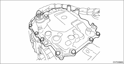 14. Install the TCM. Transmission Control Module (TCM) > INSTALLATION 15. Insert the transmission case cover (small) between transmission case cover (large) and transmission to install. NOTE: When inserting, be careful that the insulator inside transmission case cover is not turned over. Tightening torque: 7 N·m (0.7 kgf-m, 5.3 ft-lb)
