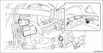 10. Remove the ST (SHEET SPECIAL TOOL). 11. Install the throttle body. Throttle Body > INSTALLATION 12. Install the transmission harness connector to the harness stay. 13. Install the transmission harness clip, and install the transmission harness stay and transmission ground terminal. Tightening torque: T1: 7 N·m (0.7 kgf-m, 5.2 ft-lb) T2: 14 N·m (1.4 kgf-m, 10.3 ft-lb)