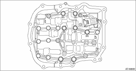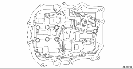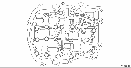 4. Install the control valve body. (1) Install the control valve body. CAUTION: • Do not damage the O-ring. • Perform installation so that the O-ring is not displaced. (2) Temporarily tighten the bolt (A: silver).