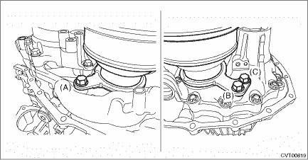 (2) Tighten the bolts in the order of (A) > (B) > (C) > (B). Tightening torque: 67.5 N·m (6.9 kgf-m, 49.8 ft-lb)