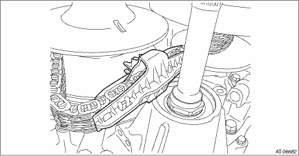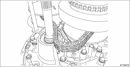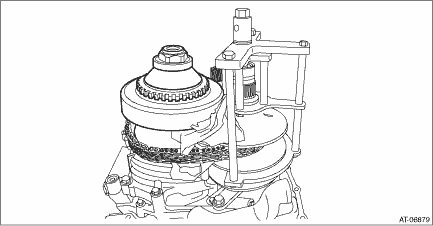 8. Expand the V groove of the secondary pulley. 9. Install the primary pulley to the reverse brake housing together with the variator chain. CAUTION: Cover the V grooves of primary pulley and secondary pulley with cloth to protect the both pulleys and variator chain from scratching. (1) Intersect the V groove of primary pulley and the V groove of secondary pulley and install the secondary pulley while placing the variator chain on secondary pulley.
