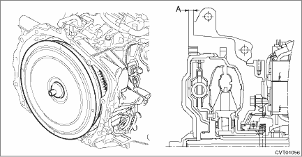 1. Install the O-ring to the input shaft. NOTE: • Use new O-rings. • Apply CVTF to the O-rings. 2. While holding the torque converter assembly by hand, carefully install it into the torque converter case. NOTE: • Apply CVTF to the oil seal lip. • Do not damage the oil seal and O-ring. 3. Engage the splines while gently rotating the torque converter assembly by hand, and securely insert the assembly. 4. Measure depth “A”, from converter case end surface to drive plate contacting surface. Standard (reference): 6.8 mm (0.268 in) or less