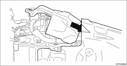 3. Insert the transmission case cover (small) between transmission case cover (large) and transmission to install. NOTE: When inserting, be careful that the insulator inside transmission case cover is not turned over. Tightening torque: 7 N·m (0.7 kgf-m, 5.2 ft-lb)