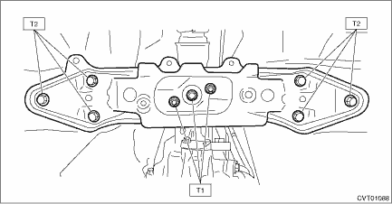 1. TRANSMISSION REAR CROSSMEMBER AND REAR CUSHION RUBBER 1. Attach the rear cushion rubber to the transmission. Tightening torque: 40 N·m (4.1 kgf-m, 29.5 ft-lb) 2. Install the crossmember. Tightening torque: T1: 35 N·m (3.6 kgf-m, 25.8 ft-lb) T2: 75 N·m (7.6 kgf-m, 55.3 ft-lb)