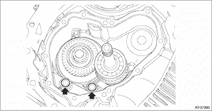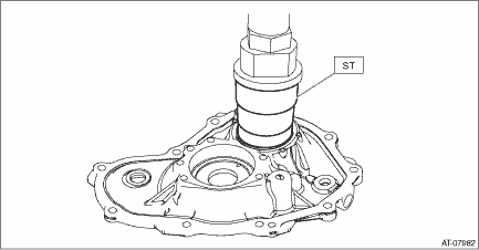 1. Clean the mating surface of converter case cover and converter case. 2. Adjust the shims of front reduction drive gear and front reduction driven gear. Front Reduction Drive Gear > ADJUSTMENT Front Reduction Driven Gear > ADJUSTMENT 3. Apply CVTF to the selected shims and install on the bearing catch surface of the front reduction driven gear. 4. Using the ST, install the ball bearing to the converter case cover. NOTE: Use a new ball bearing.