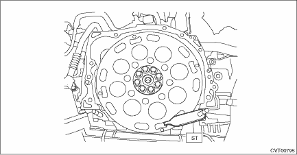 1. Temporarily install the drive plate and reinforcement drive plate. 2. Set the ST. NOTE: Set the ST to the drive plate referring to the illustration.