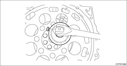 3. Tighten the drive plate mounting bolt in two stages. NOTE: Fix the engine unit. (1) Tighten the drive plate mounting bolt. Tightening torque: 10 N·m (1.0 kgf-m, 7.4 ft-lb) (2) While checking the tightening angle with the angle gauge, tighten the drive plate mounting bolts to the specified angle. Tightening angle: 41° — 45°