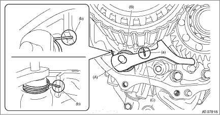 1. Set the range select lever to the “N” range. 2. Install the parking pawl shaft, return spring and parking pawl. NOTE: Make sure that the end of return spring sticks out of parking pawl as shown in (a). Make sure that the other end contacts the rib of intermediate case as shown in (b).