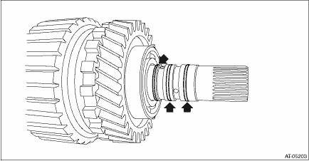 1. Apply CVTF to the seal ring and attach it to the seal ring groove of transfer clutch assembly. NOTE: • Use new seal rings. • When installing the seal rings, do not expand the seal rings too much.