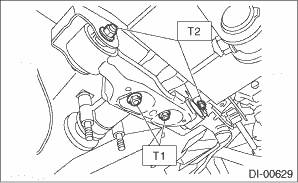 10. Install the rear differential front member with a new self-locking nut. Tightening torque: T1: 50 N·m (5.1 kgf-m, 36.9 ft-lb) T2: 110 N·m (11.2 kgf-m, 81.1 ft-lb)