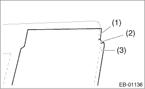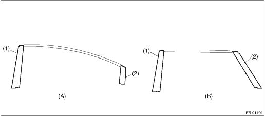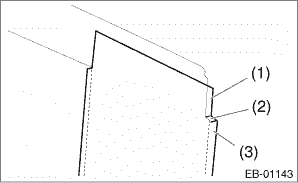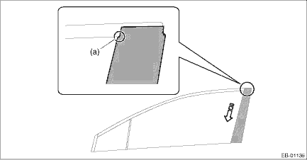 6. Install the weather strip outer - rear door. 7. Install the running channel - rear door. 8. Install the glass assembly - rear door. Tightening torque: 7.5 N·m (0.8 kgf-m, 5.5 ft-lb) 9. Install the weather strip - rear door. 10. Install the sealing cover - rear door. 11. Install the trim panel - rear door. Door Trim > INSTALLATION 12. Connect the ground terminal to battery sensor. NOTE 3. REAR DOOR OUTBACK model 1. Apply the rear door sash tape - front from the top of the vehicle towards the bottom as shown in the figure (e).