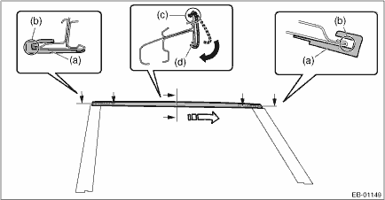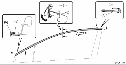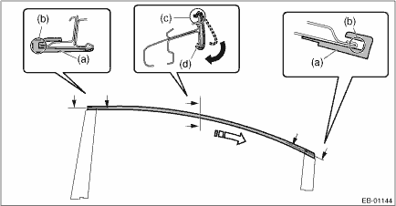 5. Install the molding - door sash rear. (1) Align the molding - door sash rear (a) with the end of the sash (b), then temporarily install by hooking it on the upper edge (c) of the sash. (2) Fit the lower edge of the sash (d) from the front side of vehicle toward the rear side of the vehicle. CAUTION: • Do not apply a concentrated load to any location of the molding - door sash, because such a load may bend the parts. • When distortion occurred to the molding - door sash, always replace it with a new part.
