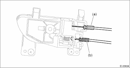 1. Before installation, check the following items. • Cable is free from deformation such as fray. • Grease is applied sufficiently to cable joints. If grease is insufficient, add it as necessary before assembling the cable. 2. Install the removed parts to the trim panel - door. 3. Install the trim panel - door. NOTE: Attach the door lock cable (a - end ball: small) to the upper side, and attach the door open cable (b - end ball: large) to the lower side.