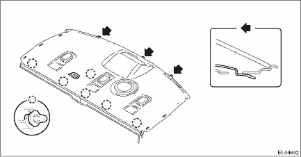 CAUTION: • Make sure that the claw behind the trim panel assembly - rear shelf is securely attached to the hole of vehicle body.